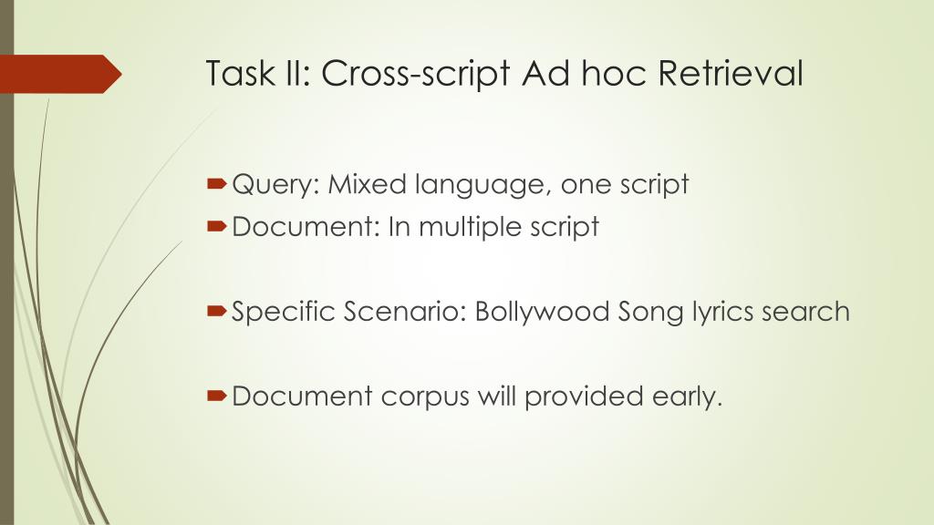 Task II: Cross-script Ad hoc Retrieval • Query: Mixed language, one script • Document: In multiple script • Specific Scenario: Bollywood Song lyrics search • Document corpus will provided early.