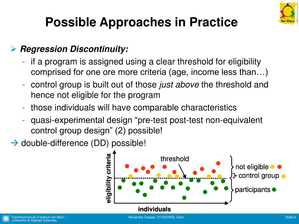 Possible Approaches in Practice • Regression Discontinuity: • if a program is assigned using a clear threshold for eligibility comprised for one ore more criteria (age, income less than…) • control group is built out of those just above the threshold and hence not eligible for the program • those individuals will have comparable characteristics • quasi-experimental design “pre-test post-test non-equivalent control group design” (2) possible! • double-difference (DD) possible!