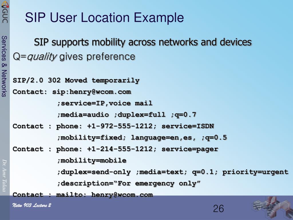 SIP User Location Example SIP supports mobility across networks and devices Q=quality gives preference SIP/2.0 302 Moved temporarily Contact: sip:henry@wcom.com ;service=IP,voice mail ;media=audio ;duplex=full ;q=0.7 Contact : phone: +1-972-555-1212; service=ISDN ;mobility=fixed; language=en,es, ;q=0.5 Contact : phone: +1-214-555-1212; service=pager ;mobility=mobile ;duplex=send-only ;media=text; q=0.1; priority=urgent ;description=“For emergency only” Contact : mailto: henry@wcom.com