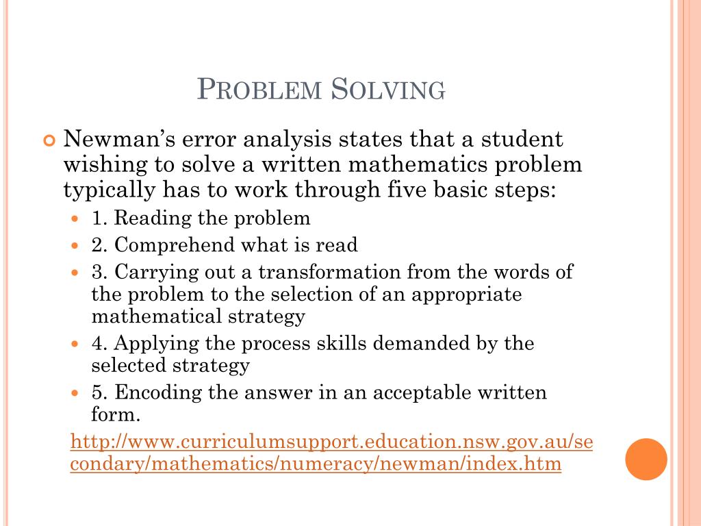 Problem Solving in Mathematics. Presented by Dot Shea 2013. Problem Solving. Newman’s error analysis states that a s tudent wishing to solve a written mathematics problem typically has to work through five basic steps: 1. Reading the problem 2. Comprehend what is read