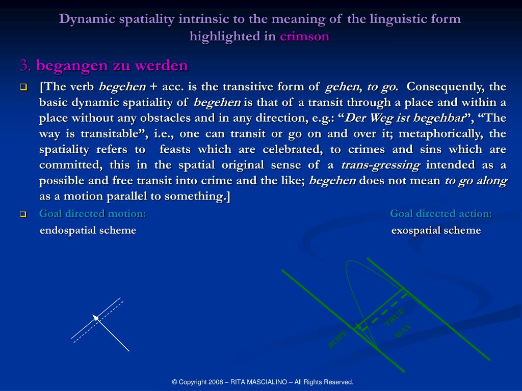 Dynamic spatiality intrinsic to the meaning of the linguistic form highlighted in crimson 3. begangen zu werden • [The verb begehen + acc. is the transitive form of gehen, to go. Consequently, the basic dynamic spatiality of begehen is that of a transit through a place and within a place without any obstacles and in any direction, e.g.: “Der Weg ist begehbar”, “The way is transitable”, i.e., one can transit or go on and over it; metaphorically, the spatiality refers to feasts which are celebrated, to crimes and sins which are committed, this in the spatial original sense of a trans-gressing intendedas a possible and free transit into crime and the like; begehen does not mean togo along as a motion parallel to something.] • Goal directed motion: Goal directed action: endospatial scheme exospatial scheme TRUE WAY ROPE
