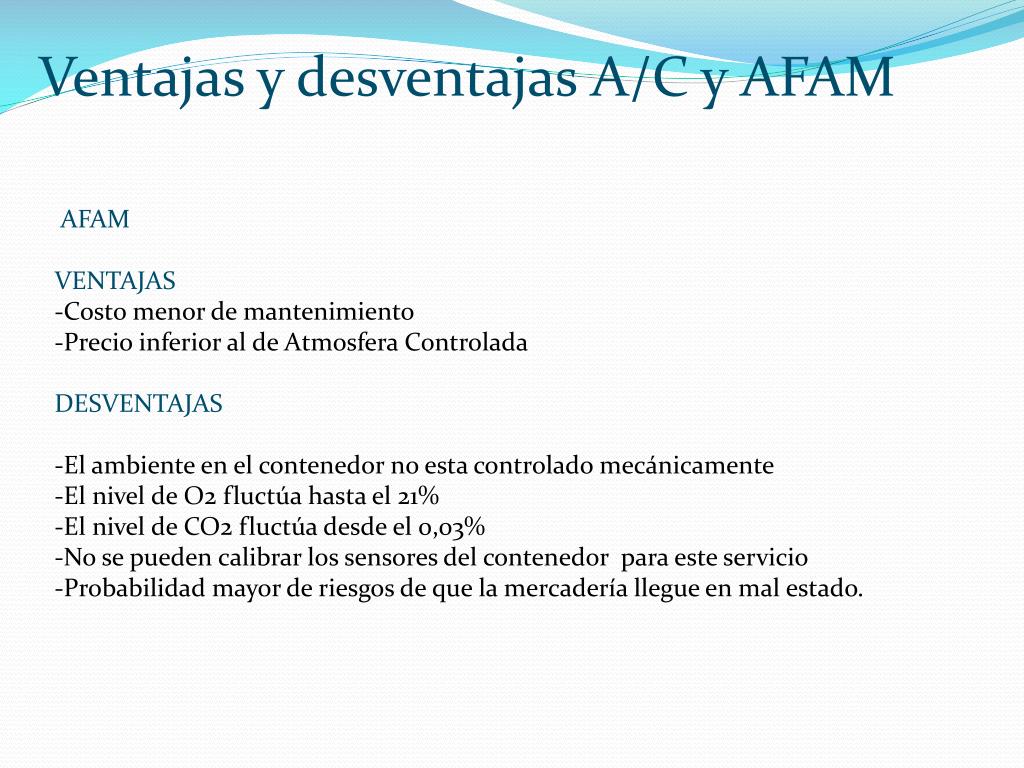 Ventajas y desventajas A/C y AFAM • AFAM • VENTAJAS • -Costo menor de mantenimiento • -Precio inferior al de Atmosfera Controlada • DESVENTAJAS • El ambiente en el contenedor no esta controlado mecánicamente • El nivel de O2 fluctúa hasta el 21% • El nivel de CO2 fluctúa desde el 0,03% • No se pueden calibrar los sensores del contenedor para este servicio • Probabilidad mayor de riesgos de que la mercadería llegue en mal estado.