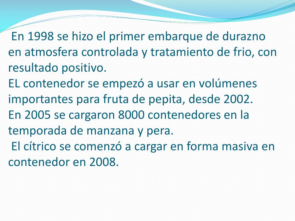 En 1998 se hizo el primer embarque de durazno en atmosfera controlada y tratamiento de frio, con resultado positivo. EL contenedor se empezó a usar en volúmenes importantes para fruta de pepita, desde 2002.En 2005 se cargaron 8000 contenedores en la temporada de manzana y pera. El cítrico se comenzó a cargar en forma masiva en contenedor en 2008.