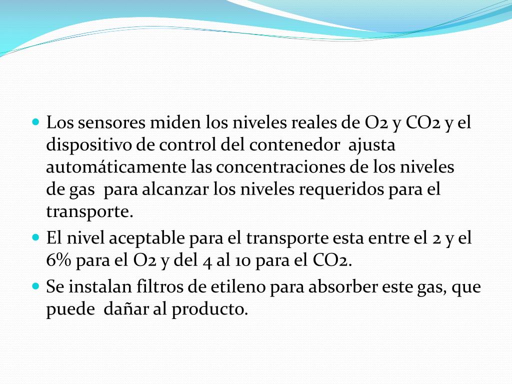 Los sensores miden los niveles reales de O2 y CO2 y el dispositivo de control del contenedor ajusta automáticamente las concentraciones de los niveles de gas para alcanzar los niveles requeridos para el transporte. • El nivel aceptable para el transporte esta entre el 2 y el 6% para el O2 y del 4 al 10 para el CO2. • Se instalan filtros de etileno para absorber este gas, que puede dañar al producto.