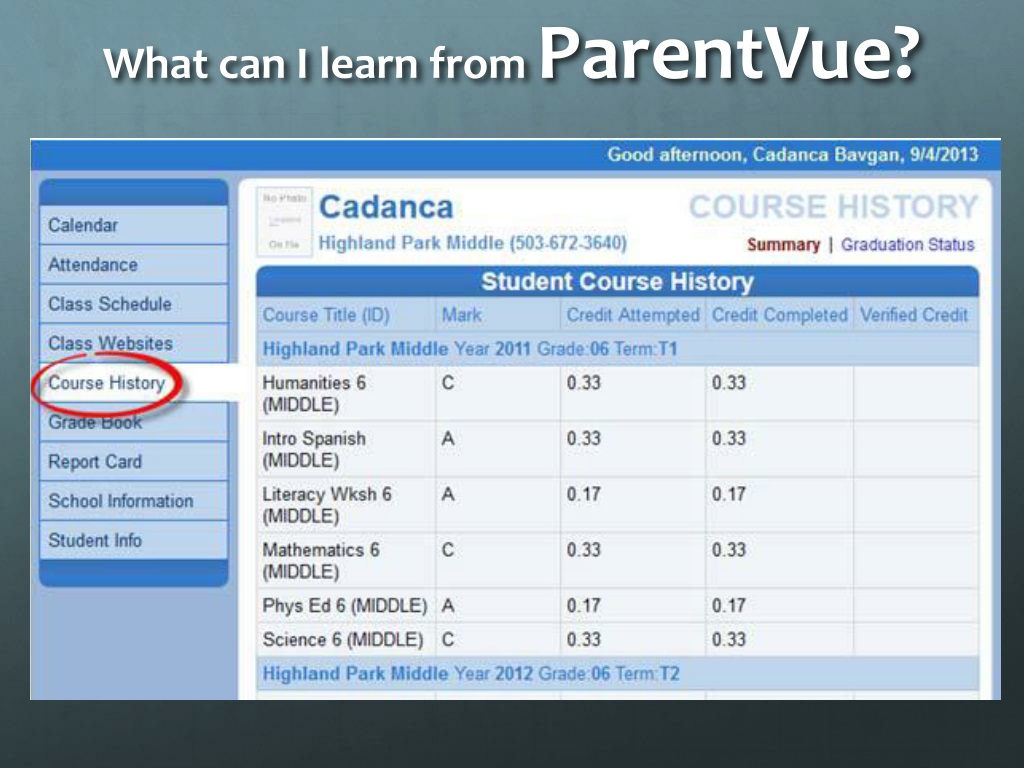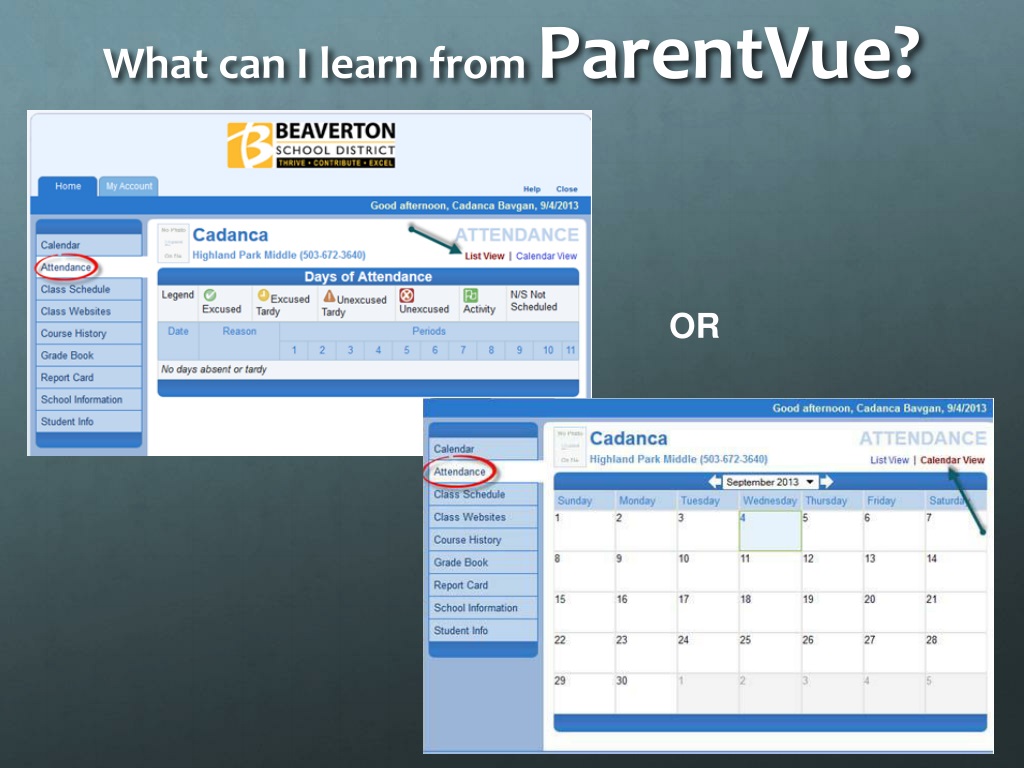 CommunicationWhat is ParentVue? • ParentVue is a web portal that allows parents and guardians to access real-time information related to the student(s). • An email or letter explaining how to log into ParentVue will be sent out to all parents and guardians on Monday, September 23rd. https://parentvue.beaverton.k12.or.us