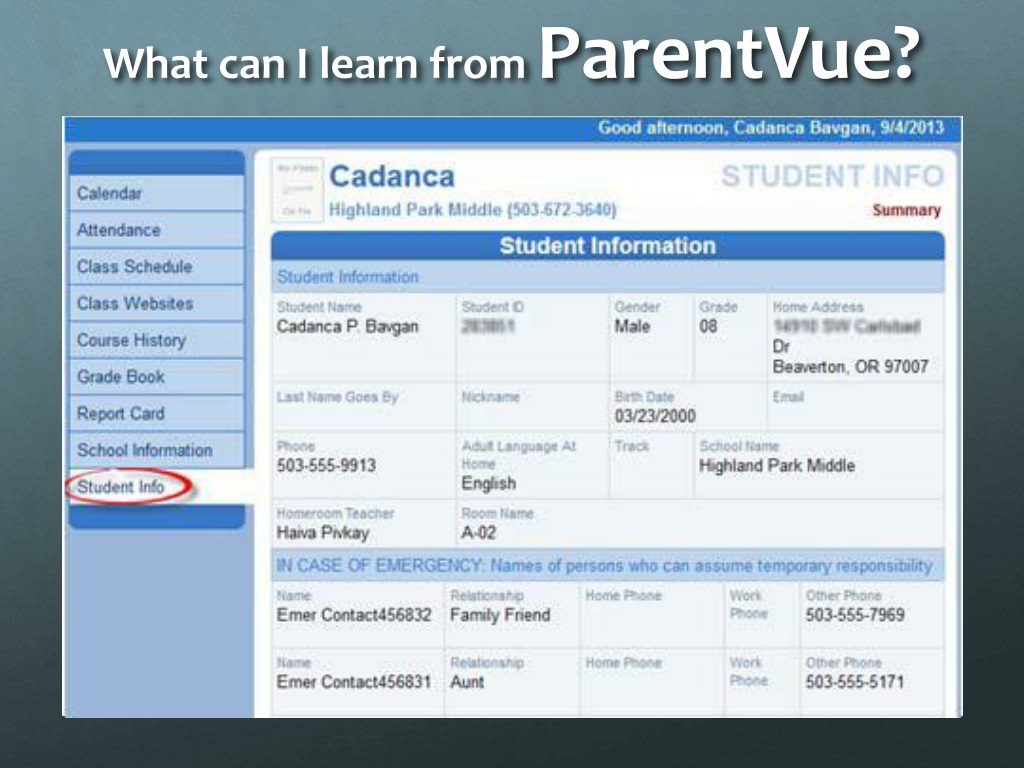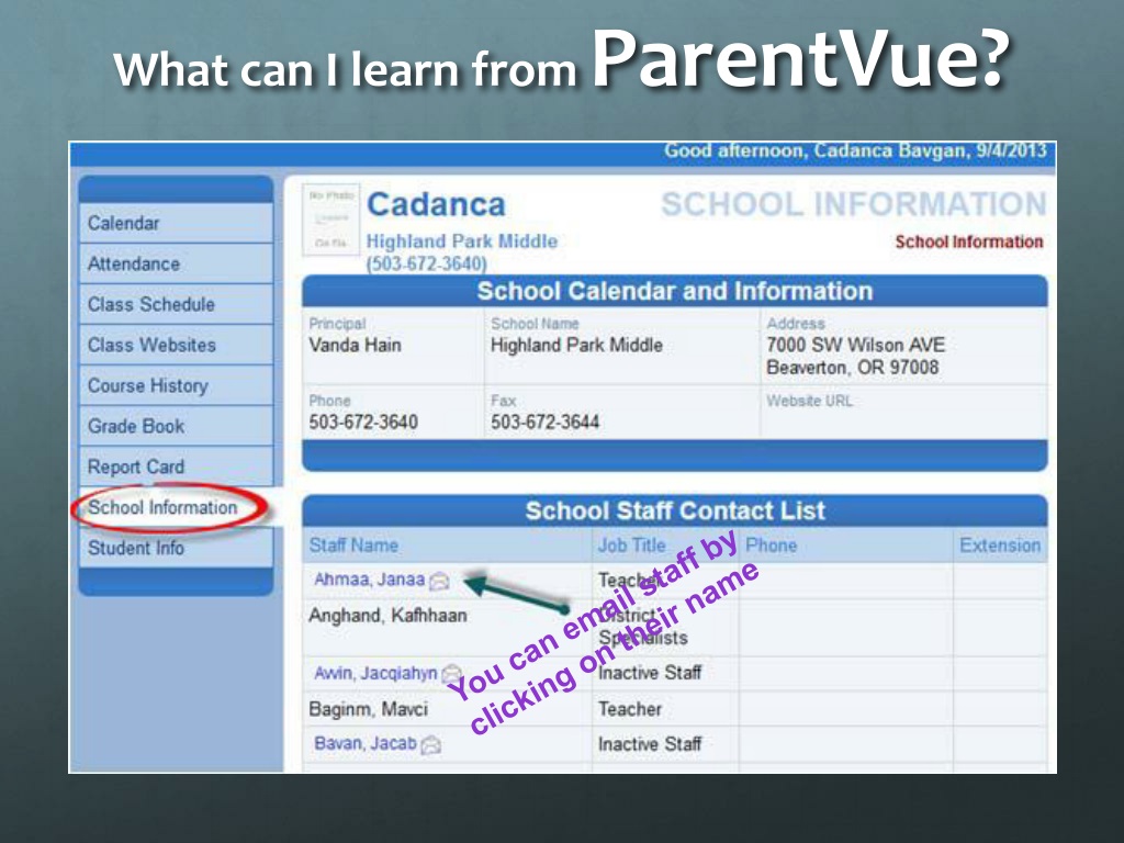 What can I learn from ParentVue? You can email staff by clicking on their name
