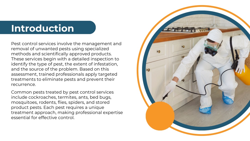 Introduction Pest control services involve the management and removal of unwanted pests using specialized methods and scientifically approved products. These services begin with a detailed inspection to identify the type of pest, the extent of infestation, and the source of the problem. Based on this assessment, trained professionals apply targeted treatments to eliminate pests and prevent their recurrence. Common pests treated by pest control services include cockroaches, termites, ants, bed bugs, mosquitoes, rodents, flies, spiders, and stored product pests. Each pest requires a unique treatment approach, making professional expertise essential for effective control.