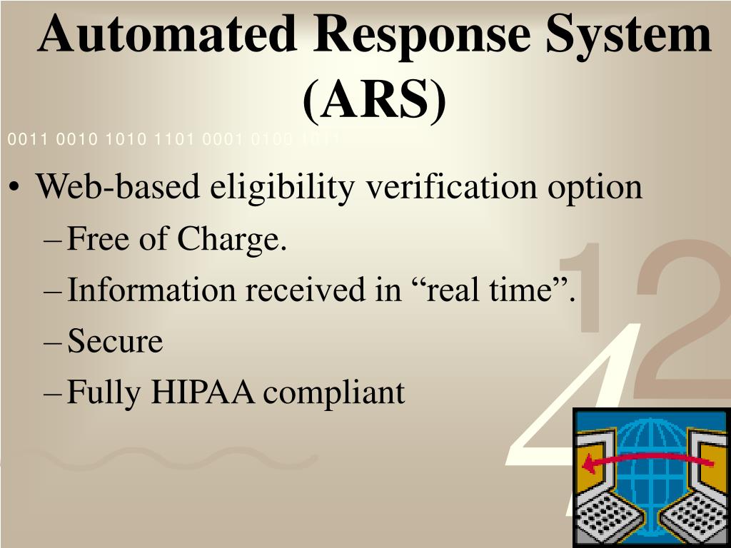 Automated Response System (ARS) • Web-based eligibility verification option • Free of Charge. • Information received in “real time”. • Secure • Fully HIPAA compliant