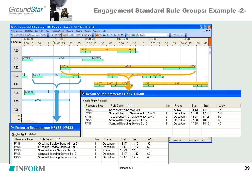 Generation of Flight-related Tasks • Tasks are generated separately per • Resource Type • Task Type (single-, multi-flight) • Rule Group Priorities are compared within rule categories only • Internal calculation of GS Planning: For each rule category R and each flight F • Collect all engagement standards in R, whose condition is satisfied by flight F (→ collection C) • Within collection C, detect the highest priority P • From collection C, keep only engagement standards with priority P (→ sub-collection C’) • Generate tasks according to definitions of all engagement standards in C’ “Rule Category” Release 6-5