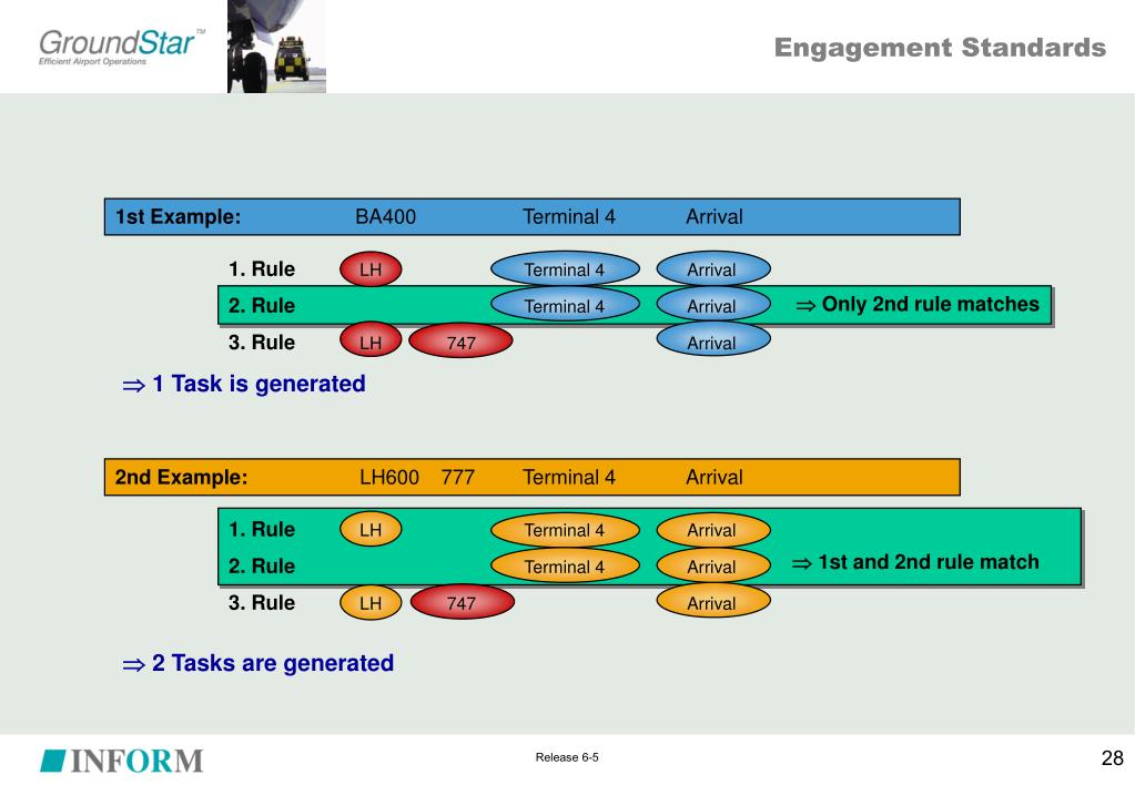1st rule matches 3rd rule matches 1 1 Engagement Standards and Priorities 5 3rd Example -1: LH300 747 Terminal 4 Arrival 1. RuleLH Terminal 4 Arrival 2. Rule 777 Terminal 4 Arrival 3. RuleLH 747 Arrival 2 Tasks are generated 3rd Example -2: LH300 747 Terminal 4 Arrival Priority 1. RuleLH Terminal 4 Arrival 2. Rule 777Terminal 4 Arrival 3. RuleLH 747 Arrival 3rd rule matches 1 Task is generated Release 6-5