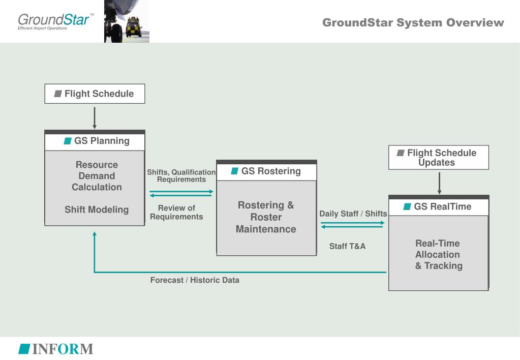 Groundstar Planning Staff & Equipment Training. Overview. Net Planning. Shift Planning. Integration with Rostering. GroundStar System Overview. Flight Schedule. GS Planning Resource Demand Calculation Shift Modeling. Flight Schedule Updates. GS Rostering Rostering & Roster