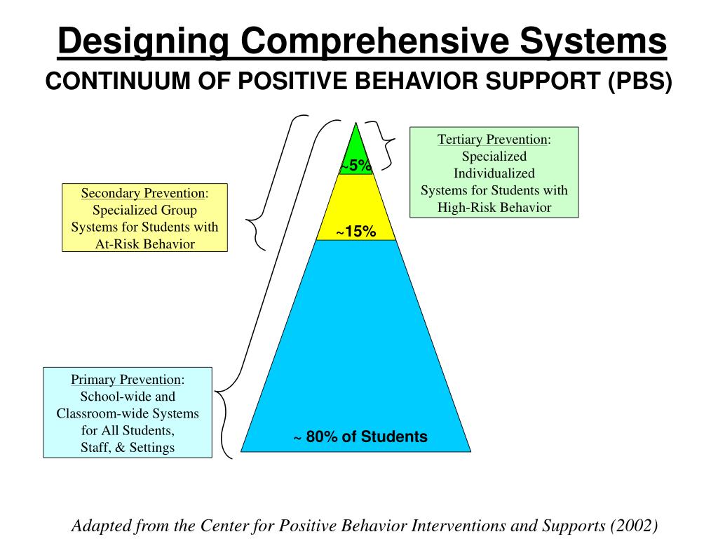 Designing Comprehensive Systems CONTINUUM OF POSITIVE BEHAVIOR SUPPORT (PBS) Adapted from the Center for Positive Behavior Interventions and Supports (2002)