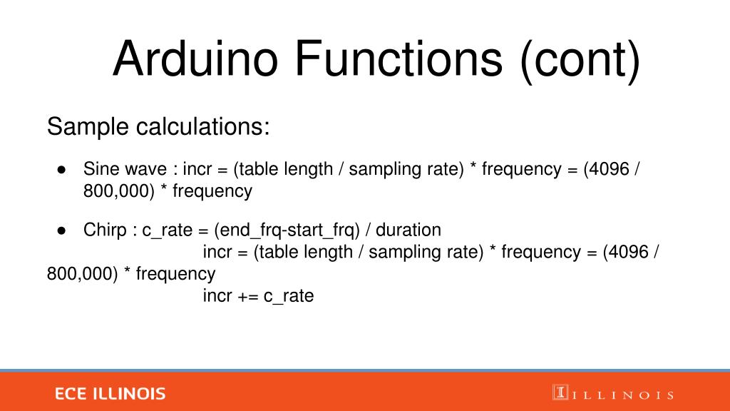 Sample calculations: • Sine wave : incr = (table length / sampling rate) * frequency = (4096 / 800,000) * frequency • Chirp : c_rate = (end_frq-start_frq) / duration incr = (table length / sampling rate) * frequency = (4096 / 800,000) * frequency incr += c_rate Arduino Functions (cont)