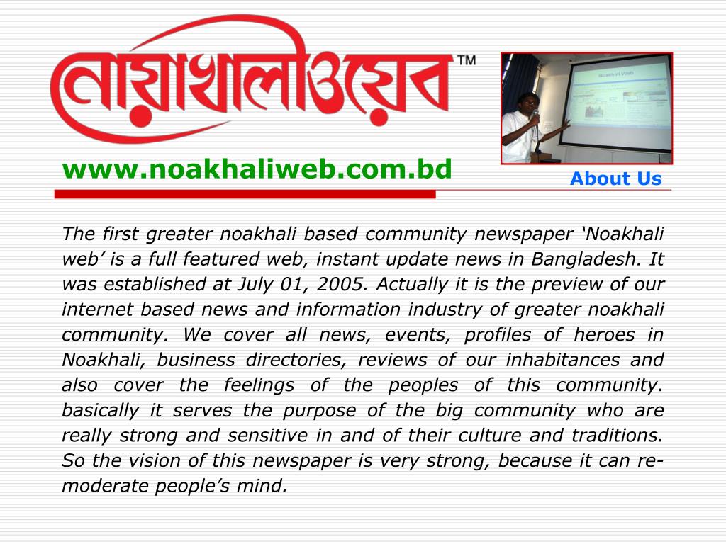 www.noakhaliweb.com.bd About Us The first greater noakhali based community newspaper ‘Noakhali web’ is a full featured web, instant update news in Bangladesh. It was established at July 01, 2005. Actually it is the preview of our internet based news and information industry of greater noakhali community. We cover all news, events, profiles of heroes in Noakhali, business directories, reviews of our inhabitances and also cover the feelings of the peoples of this community. basically it serves the purpose of the big community who are really strong and sensitive in and of their culture and traditions. So the vision of this newspaper is very strong, because it can re-moderate people’s mind.