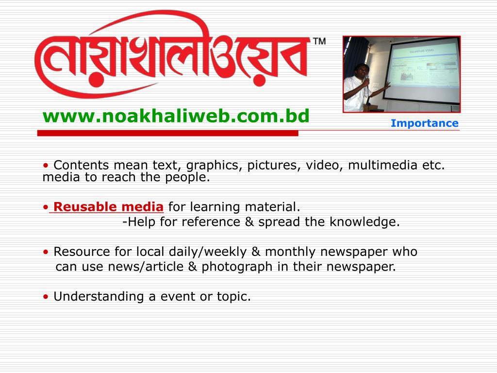 www.noakhaliweb.com.bd Importance Contents mean text, graphics, pictures, video, multimedia etc. media to reach the people. Reusable media for learning material. -Help for reference & spread the knowledge. Resource for local daily/weekly & monthly newspaper who can use news/article & photograph in their newspaper. Understanding a event or topic.