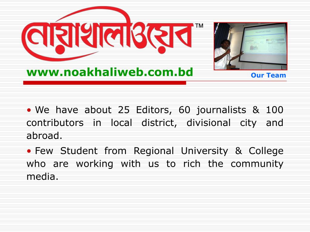 www.noakhaliweb.com.bd Our Team We have about 25 Editors, 60 journalists & 100 contributors in local district, divisional city and abroad. Few Student from Regional University & College who are working with us to rich the community media.