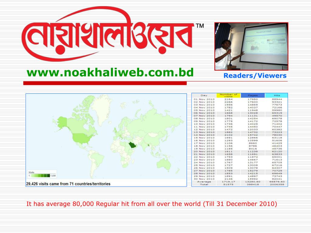 www.noakhaliweb.com.bd Readers/Viewers It has average 80,000 Regular hit from all over the world (Till 31 December 2010)