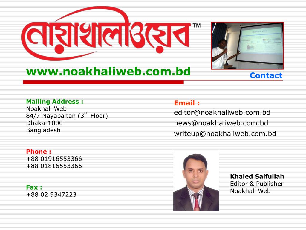 www.noakhaliweb.com.bd Contact Email : editor@noakhaliweb.com.bd news@noakhaliweb.com.bd writeup@noakhaliweb.com.bd Mailing Address : Noakhali Web 84/7 Nayapaltan (3rd Floor) Dhaka-1000 Bangladesh Phone : +88 01916553366 +88 01816553366 Fax : +88 02 9347223 Khaled Saifullah Editor & Publisher Noakhali Web