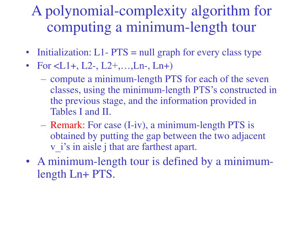 A polynomial-complexity algorithm for computing a minimum-length tour • Initialization: L1- PTS = null graph for every class type • For <L1+, L2-, L2+,…,Ln-, Ln+) • compute a minimum-length PTS for each of the seven classes, using the minimum-length PTS’s constructed in the previous stage, and the information provided in Tables I and II. • Remark: For case (I-iv), a minimum-length PTS is obtained by putting the gap between the two adjacent v_i’s in aisle j that are farthest apart. • A minimum-length tour is defined by a minimum-length Ln+ PTS.
