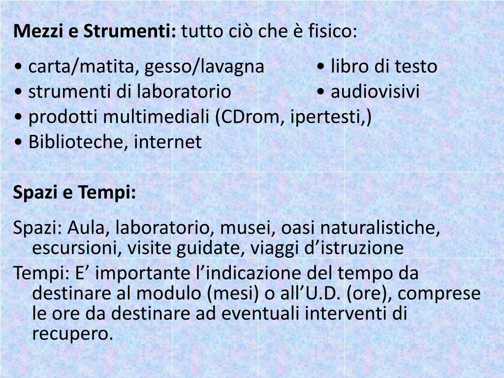 Mezzi e Strumenti: tutto ciò che è fisico: • carta/matita, gesso/lavagna • libro di testo • strumenti di laboratorio • audiovisivi • prodotti multimediali (CDrom, ipertesti,) • Biblioteche, internet Spazi e Tempi: Spazi: Aula, laboratorio, musei, oasi naturalistiche, escursioni, visite guidate, viaggi d’istruzione Tempi: E’ importante l’indicazione del tempo da destinare al modulo (mesi) o all’U.D. (ore), comprese le ore da destinare ad eventuali interventi di recupero.