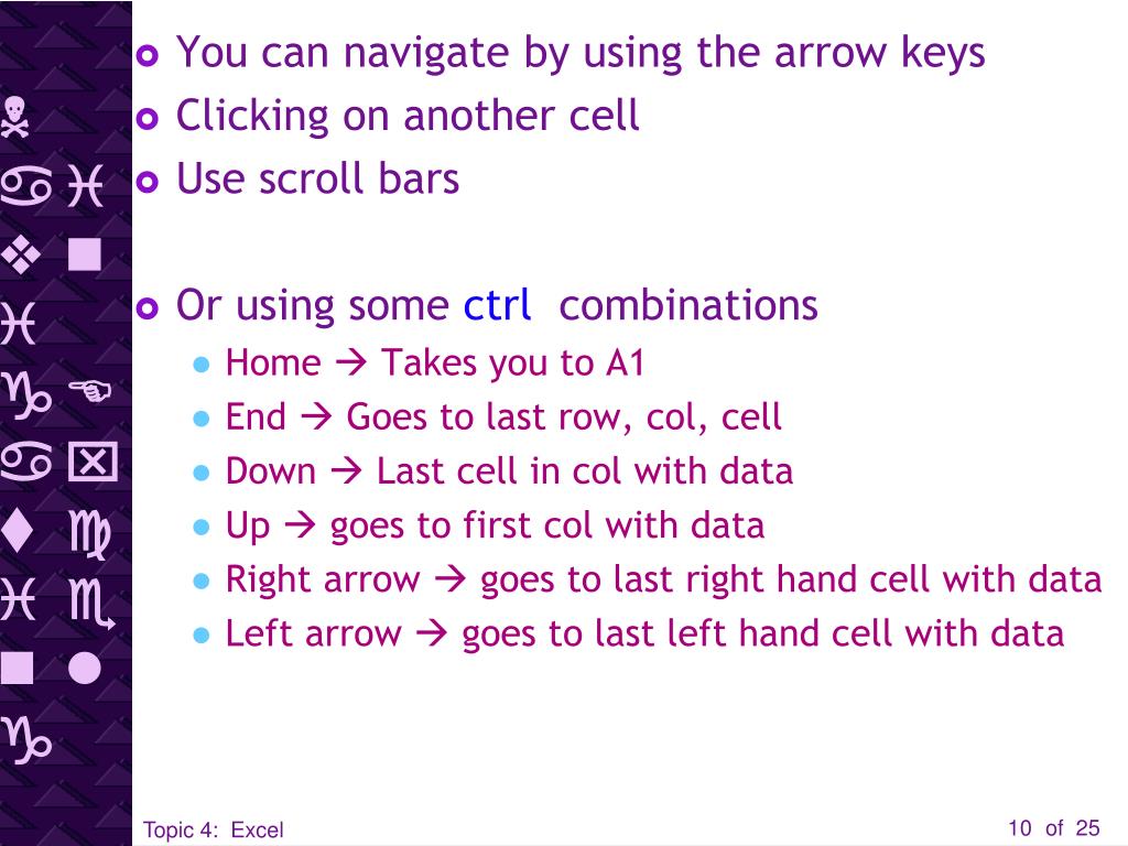 Navigating in Excel • You can navigate by using the arrow keys • Clicking on another cell • Use scroll bars • Or using some ctrl combinations • Home Takes you to A1 • End Goes to last row, col, cell • Down Last cell in col with data • Up goes to first col with data • Right arrow goes to last right hand cell with data • Left arrow goes to last left hand cell with data of 25