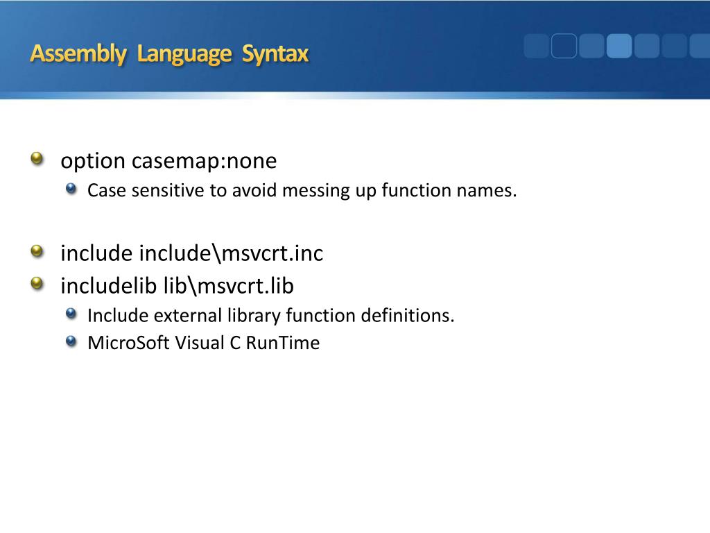 AssemblyLanguageSyntax • option casemap:none • Case sensitive to avoid messing up function names. • include include\msvcrt.inc • includeliblib\msvcrt.lib • Include external library function definitions. • MicroSoftVisual C RunTime