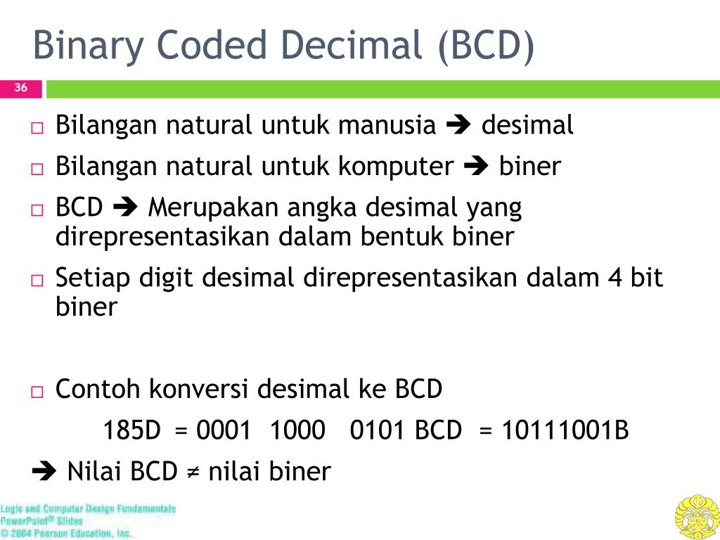 Binary Coded Decimal (BCD) • Bilangan natural untuk manusia desimal • Bilangan natural untuk komputer biner • BCD Merupakan angka desimal yang direpresentasikan dalam bentuk biner • Setiap digit desimal direpresentasikan dalam 4 bit biner • Contoh konversi desimal ke BCD 185D = 0001 1000 0101 BCD = 10111001B Nilai BCD ≠ nilai biner