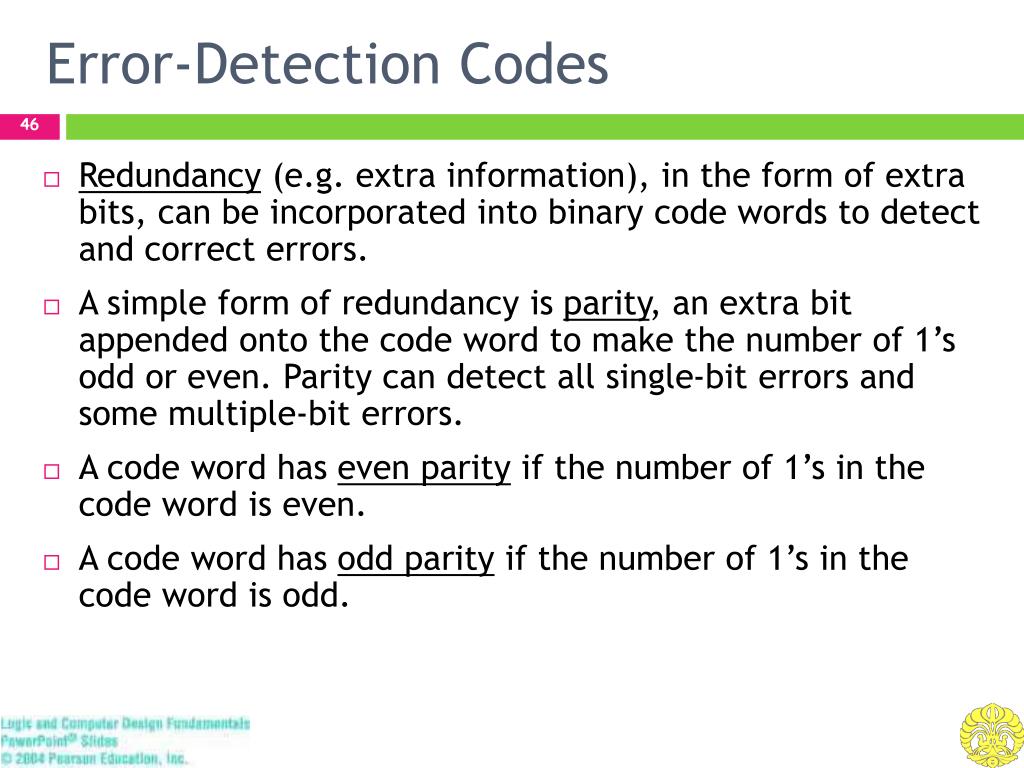 Error-Detection Codes • Redundancy (e.g. extra information), in the form of extra bits, can be incorporated into binary code words to detect and correct errors. • A simple form of redundancy is parity, an extra bit appended onto the code word to make the number of 1’s odd or even. Parity can detect all single-bit errors and some multiple-bit errors. • A code word has even parity if the number of 1’s in the code word is even. • A code word has odd parity if the number of 1’s in the code word is odd.