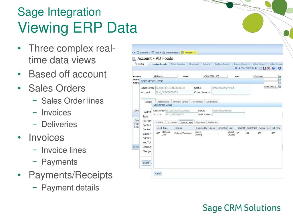 Sage IntegrationViewing ERP Data • Three complex real-time data views • Based off account • Sales Orders • Sales Order lines • Invoices • Deliveries • Invoices • Invoice lines • Payments • Payments/Receipts • Payment details