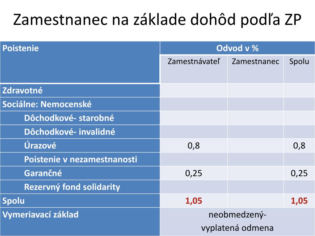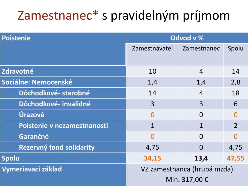 Odvodový systém. výber prostriedkov na financovanie systému sociálneho zabezpečenia zdravotné Typy poistenia sociálne - Skupiny poistencov. Zamestnanec v pracovnom pomere. Zamestnanec * s pravidelným príjmom. Zamestnanec * s ne pravidelným príjmom.