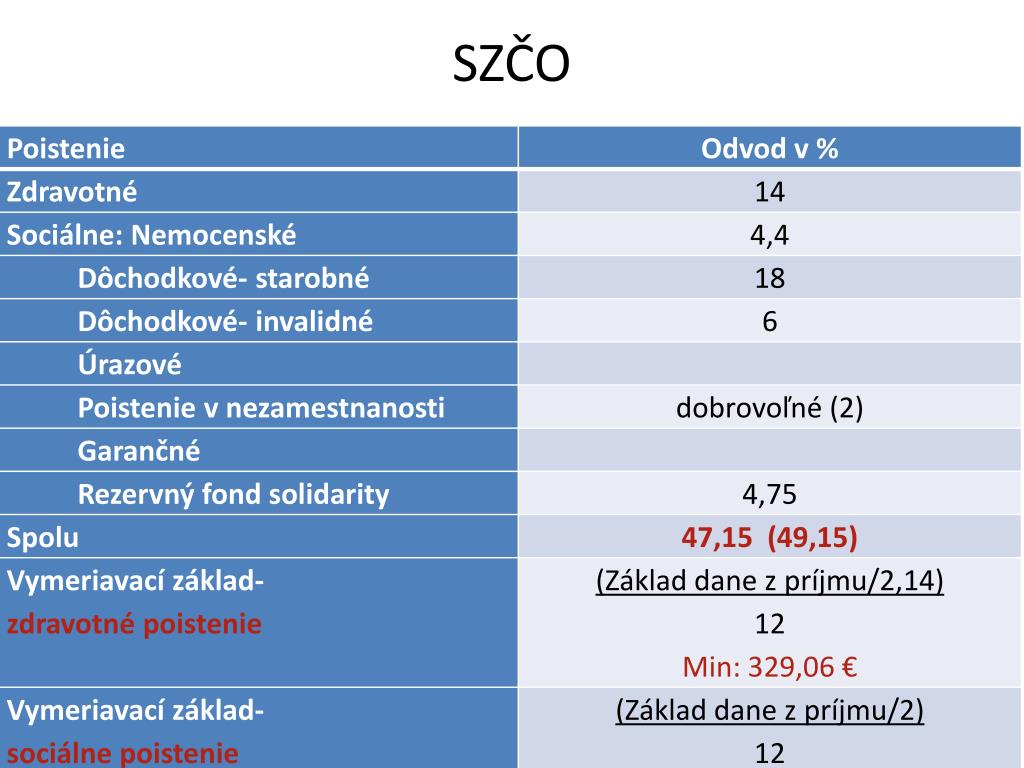 Navrhované zmeny- vymeriavací základ Jednotný vymeriavací základ = VZ pre sociálne poistenie VZ pre zdravotné poistenie = základ dane z príjmu SZČO- minimálny = 3,3 násobok životného minima - zrušenie koeficientov 2 (sociálne poistenie) 2,14 (zdravotné poistenie) Maximálny vymeriavací základ nahrádza – maximálnym poistným (určenie maximálnej sumy poistného na kalendárny rok)