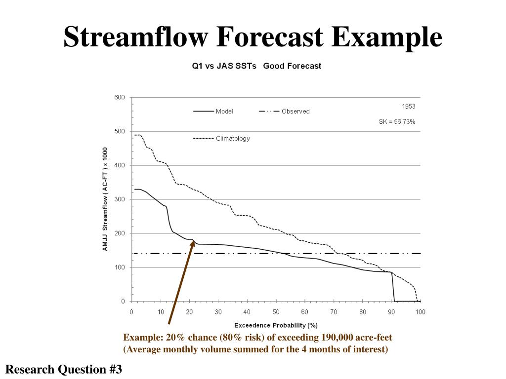 Streamflow Forecast Example Example: 20% chance (80% risk) of exceeding 190,000 acre-feet (Average monthly volume summed for the 4 months of interest) Research Question #3