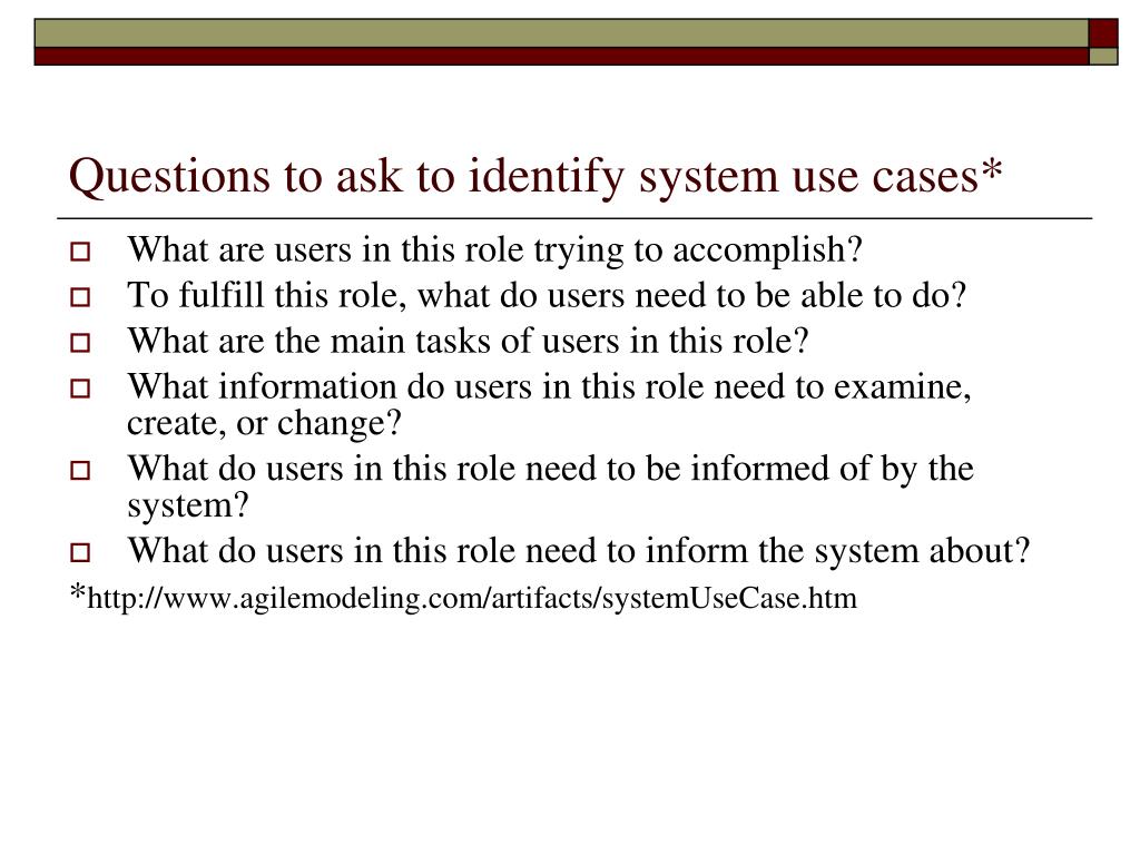Questions to ask to identify system use cases* • What are users in this role trying to accomplish? • To fulfill this role, what do users need to be able to do? • What are the main tasks of users in this role? • What information do users in this role need to examine, create, or change? • What do users in this role need to be informed of by the system? • What do users in this role need to inform the system about? *http://www.agilemodeling.com/artifacts/systemUseCase.htm