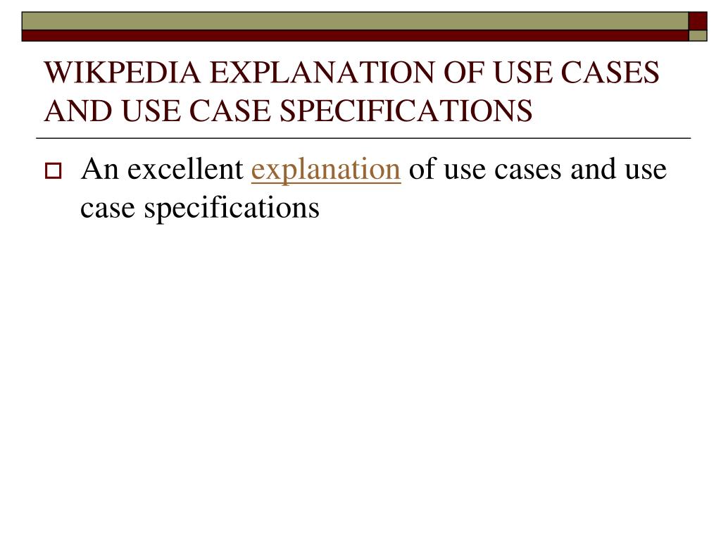 WIKPEDIA EXPLANATION OF USE CASES AND USE CASE SPECIFICATIONS • An excellent explanation of use cases and use case specifications