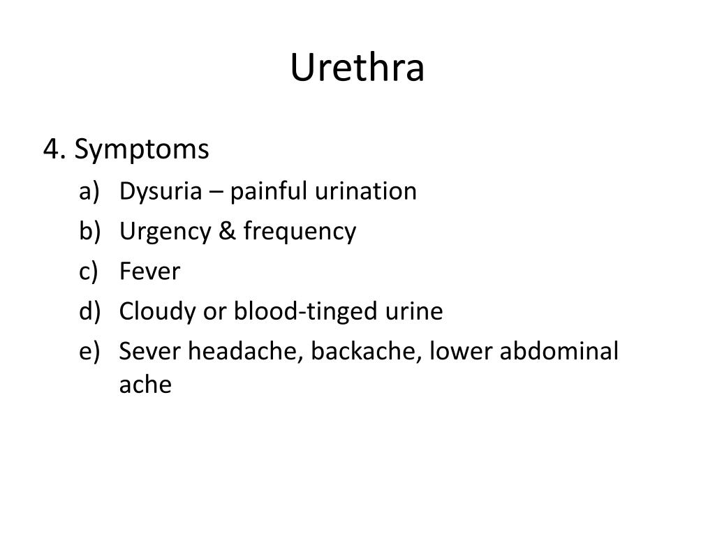Urethra 4. Symptoms • Dysuria – painful urination • Urgency & frequency • Fever • Cloudy or blood-tinged urine • Sever headache, backache, lower abdominal ache