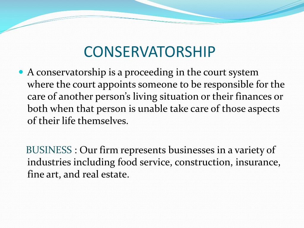 CONSERVATORSHIP • A conservatorship is a proceeding in the court system where the court appoints someone to be responsible for the care of another person’s living situation or their finances or both when that person is unable take care of those aspects of their life themselves. BUSINESS : Our firm represents businesses in a variety of industries including food service, construction, insurance, fine art, and real estate.