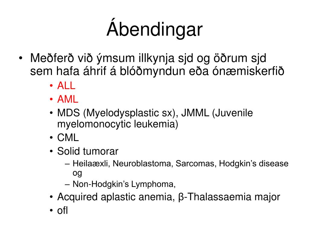 Ábendingar • Meðferð við ýmsum illkynja sjd og öðrum sjd sem hafa áhrif á blóðmyndun eða ónæmiskerfið • ALL • AML • MDS (Myelodysplastic sx), JMML (Juvenile myelomonocytic leukemia) • CML • Solid tumorar • Heilaæxli, Neuroblastoma, Sarcomas, Hodgkin’s disease og • Non-Hodgkin’s Lymphoma, • Acquired aplastic anemia, β-Thalassaemia major • ofl