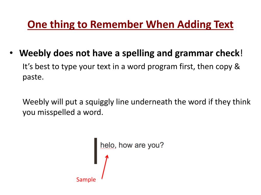 One thing to Remember When Adding Text • Weebly does not have a spelling and grammar check! It’s best to type your text in a word program first, then copy & paste. Weebly will put a squiggly line underneath the word if they think you misspelled a word. Sample