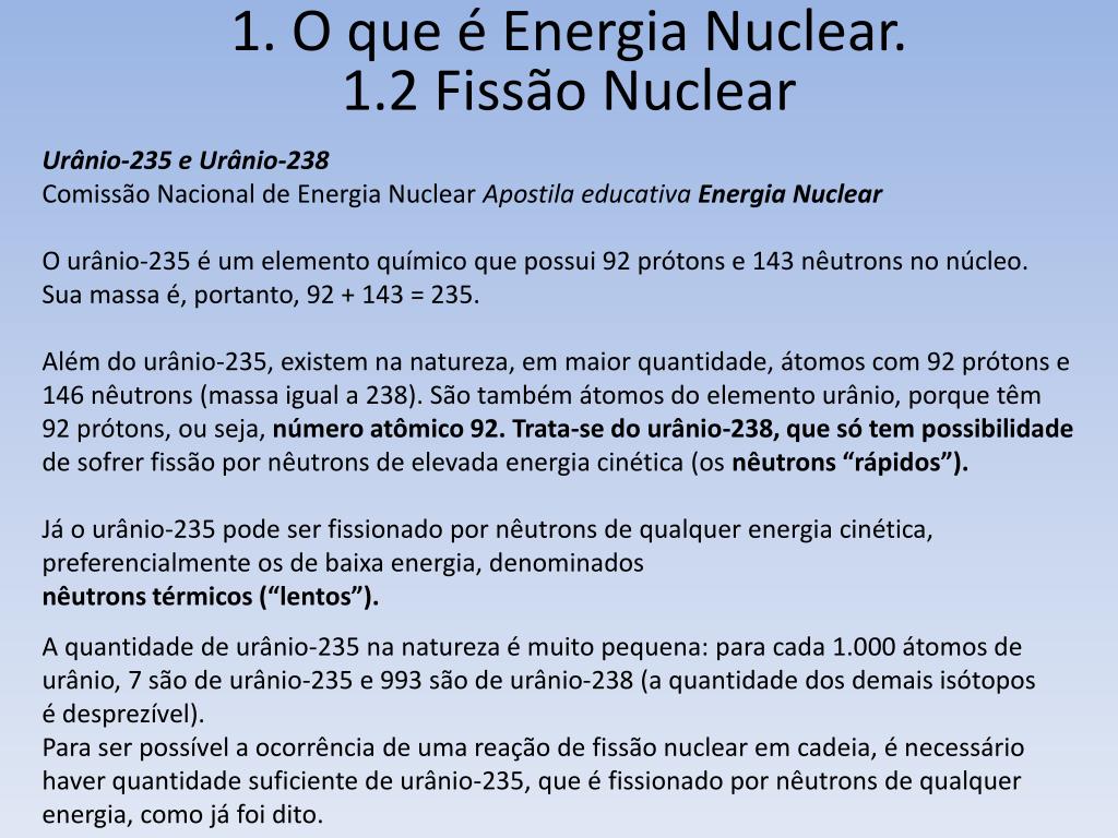 1. O que é Energia Nuclear.1.2Fissão Nuclear Urânio-235 e Urânio-238 Comissão Nacional de Energia Nuclear Apostila educativa Energia Nuclear O urânio-235 é um elemento químico que possui 92 prótons e 143 nêutrons no núcleo. Sua massa é, portanto, 92 + 143 = 235. Além do urânio-235, existem na natureza, em maior quantidade, átomos com 92 prótons e 146 nêutrons (massa igual a 238). São também átomos do elemento urânio, porque têm 92 prótons, ou seja, número atômico 92. Trata-se do urânio-238, que só tem possibilidade de sofrer fissão por nêutrons de elevada energia cinética (os nêutrons “rápidos”). Já o urânio-235 pode ser fissionado por nêutrons de qualquer energia cinética, preferencialmente os de baixa energia, denominados nêutrons térmicos (“lentos”). A quantidade de urânio-235 na natureza é muito pequena: para cada 1.000 átomos de urânio, 7 são de urânio-235 e 993 são de urânio-238 (a quantidade dos demais isótopos é desprezível). Para ser possível a ocorrência de uma reação de fissão nuclear em cadeia, é necessário haver quantidade suficiente de urânio-235, que é fissionado por nêutrons de qualquer energia, como já foi dito.