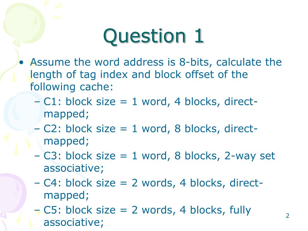 Question 1 • Assume the word address is 8-bits, calculate the length of tag index and block offset of the following cache: • C1: block size = 1 word, 4 blocks, direct-mapped; • C2: block size = 1 word, 8 blocks, direct-mapped; • C3: block size = 1 word, 8 blocks, 2-way set associative; • C4: block size = 2 words, 4 blocks, direct-mapped; • C5: block size = 2 words, 4 blocks, fully associative;