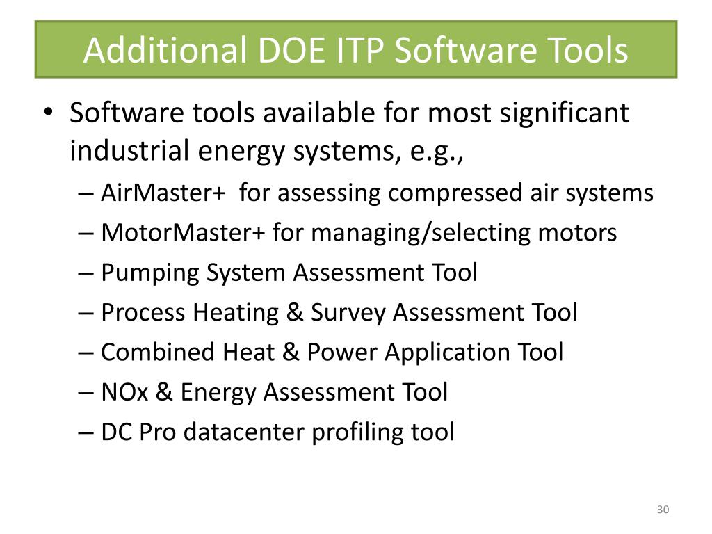 Additional DOE ITP Software Tools • Software tools available for most significant industrial energy systems, e.g., • AirMaster+ for assessing compressed air systems • MotorMaster+ for managing/selecting motors • Pumping System Assessment Tool • Process Heating & Survey Assessment Tool • Combined Heat & Power Application Tool • NOx & Energy Assessment Tool • DC Pro datacenter profiling tool