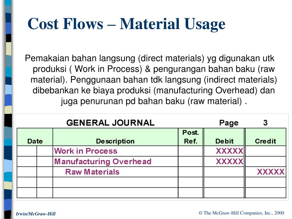 Cost Flows – Material Usage Pemakaian bahan langsung (direct materials) yg digunakan utk produksi ( Work in Process)& pengurangan bahan baku (raw material). Penggunaan bahan tdk langsung (indirect materials) dibebankan ke biaya produksi (manufacturing Overhead) dan juga penurunan pd bahan baku (raw material) .