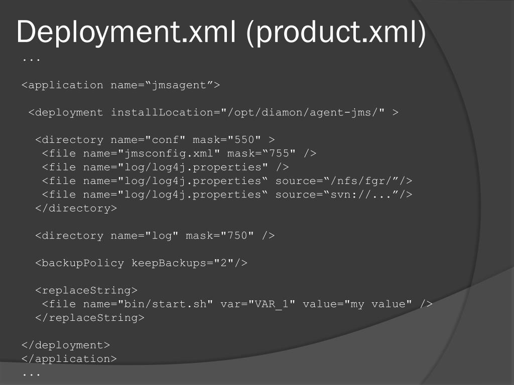 Deployment.xml (product.xml) ... <application name=“jmsagent”> <deployment installLocation="/opt/diamon/agent-jms/" > <directory name="conf" mask="550" > <file name="jmsconfig.xml" mask=“755" /> <file name="log/log4j.properties" /> <file name="log/log4j.properties“ source=“/nfs/fgr/”/> <file name="log/log4j.properties“ source=“svn://...”/> </directory> <directory name="log" mask="750" /> <backupPolicykeepBackups="2"/> <replaceString> <file name="bin/start.sh" var="VAR_1" value="my value" /> </replaceString> </deployment> </application> ...