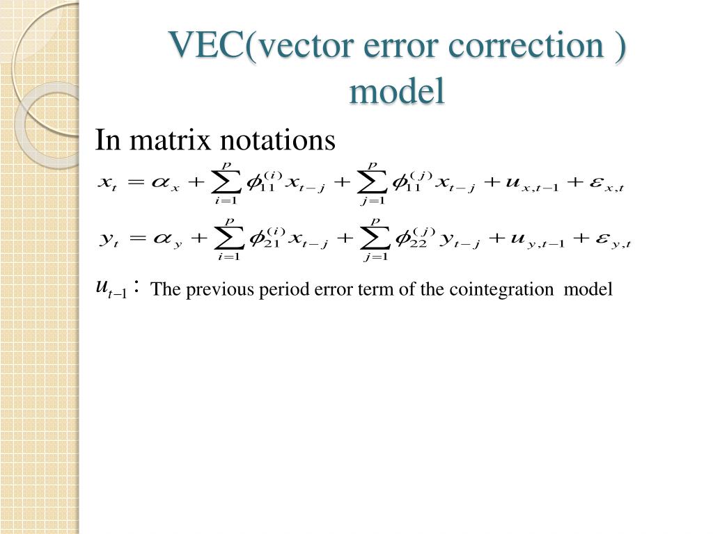 VEC(vector error correction )model In matrix notations The previous period error term of the cointegration model