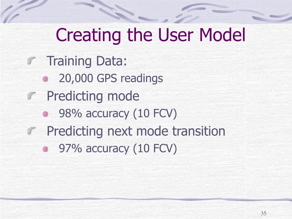 Creating the User Model • Training Data: • 20,000 GPS readings • Predicting mode • 98% accuracy (10 FCV) • Predicting next mode transition • 97% accuracy (10 FCV)