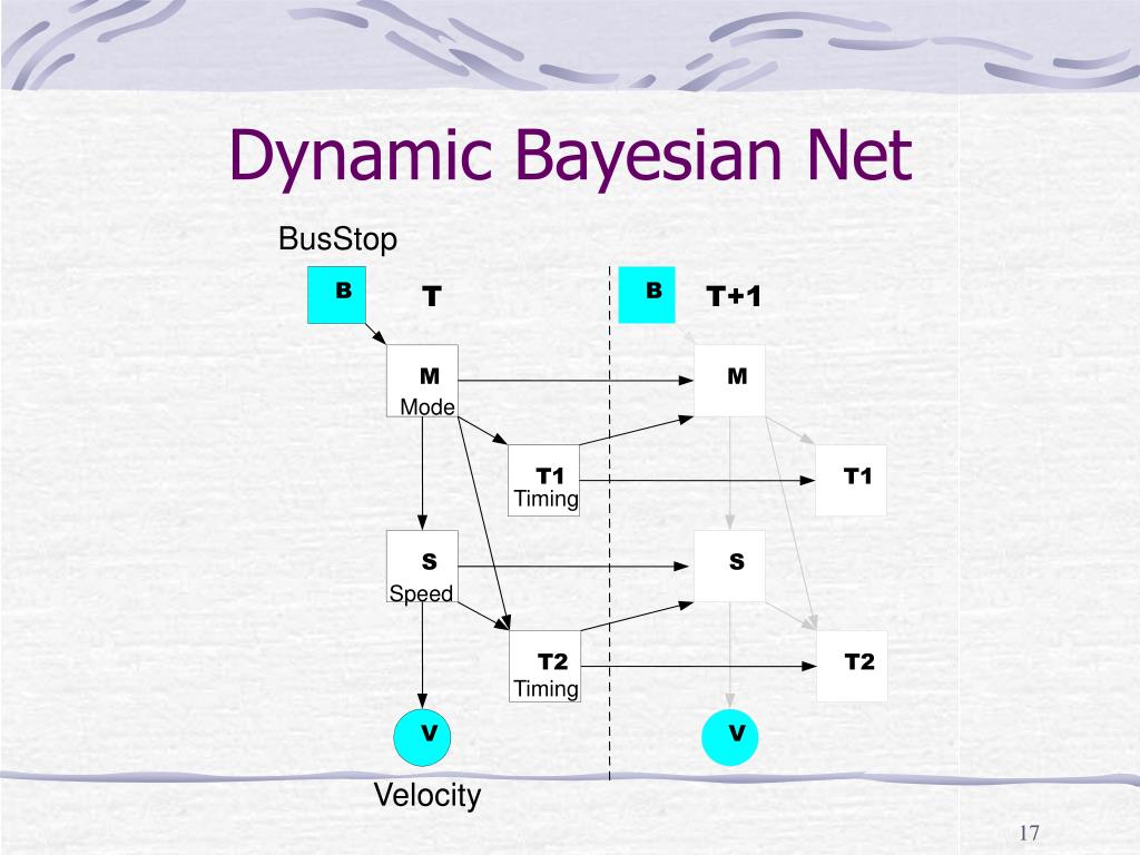 Dynamic Bayesian Net BusStop B B T T+1 M M Mode T1 T1 Timing S S Speed T2 T2 Timing V V Velocity
