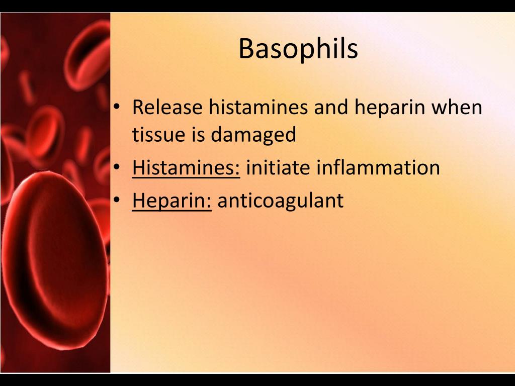 Basophils • Release histamines and heparin when tissue is damaged • Histamines: initiate inflammation • Heparin: anticoagulant