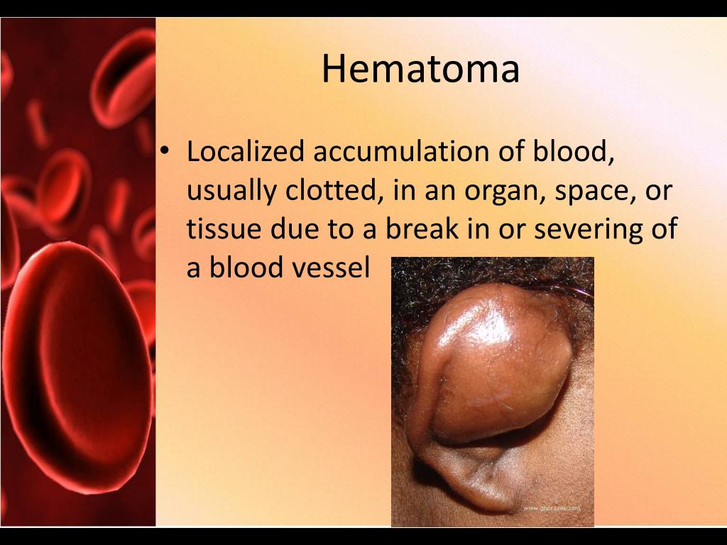 Hematoma • Localized accumulation of blood, usually clotted, in an organ, space, or tissue due to a break in or severing of a blood vessel