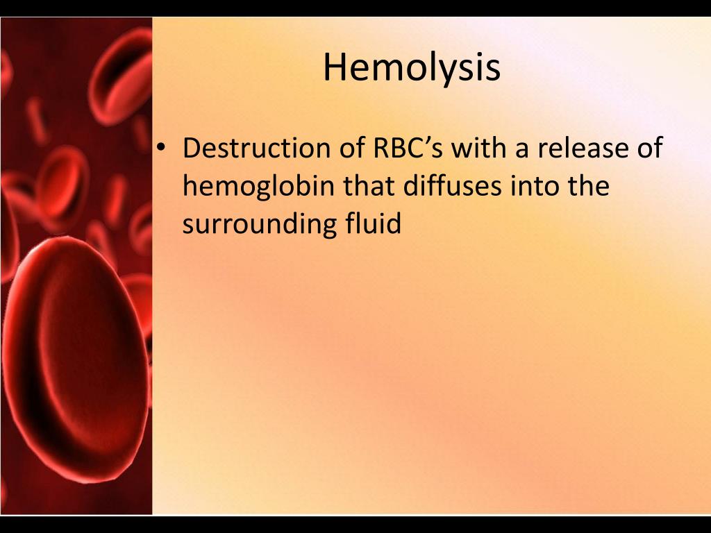 Hemolysis • Destruction of RBC’s with a release of hemoglobin that diffuses into the surrounding fluid