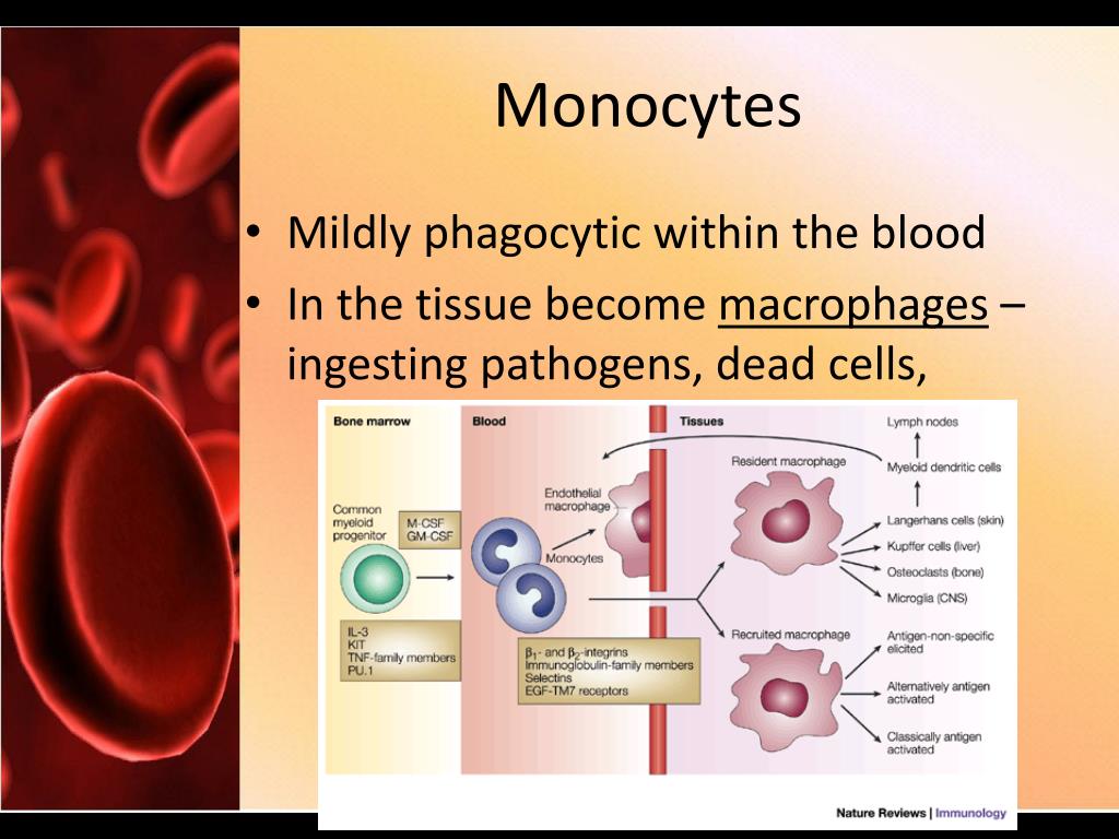 Monocytes • Mildly phagocytic within the blood • In the tissue become macrophages – ingesting pathogens, dead cells,